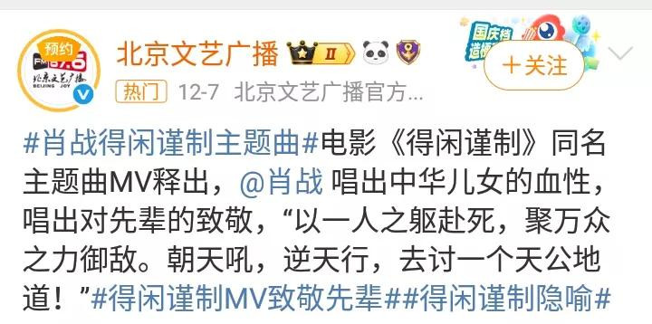北京文艺播送在外交平台发文:“肖战唱出对先辈的问候”。歌以咏志,乐为心声!歌曲传情达意,和电影《得闲谨制》剧情相呼应,长远东谈主心,从而激发宽敞不雅众的共识! 是以,看电影《得闲谨制》,不单是是对剧情的玩赏,还有对国度的爱好与衷心!